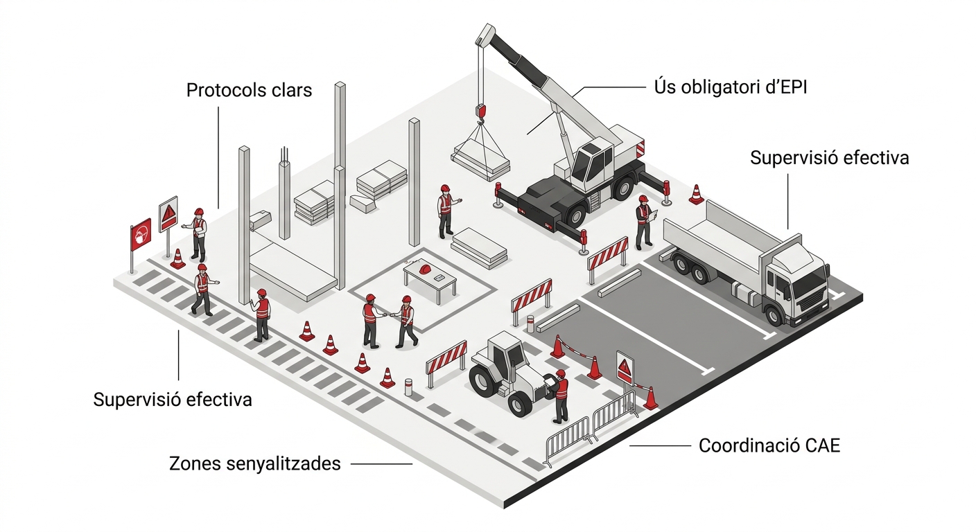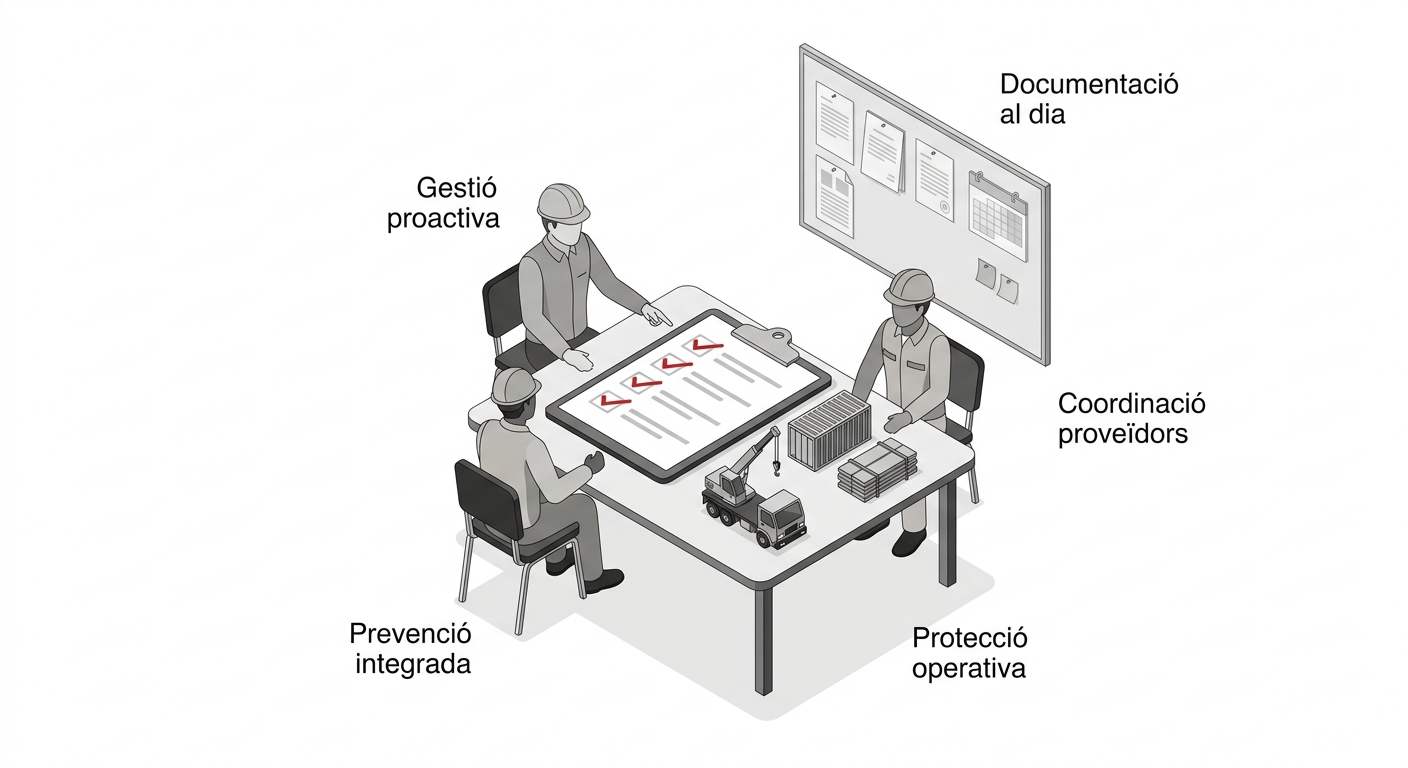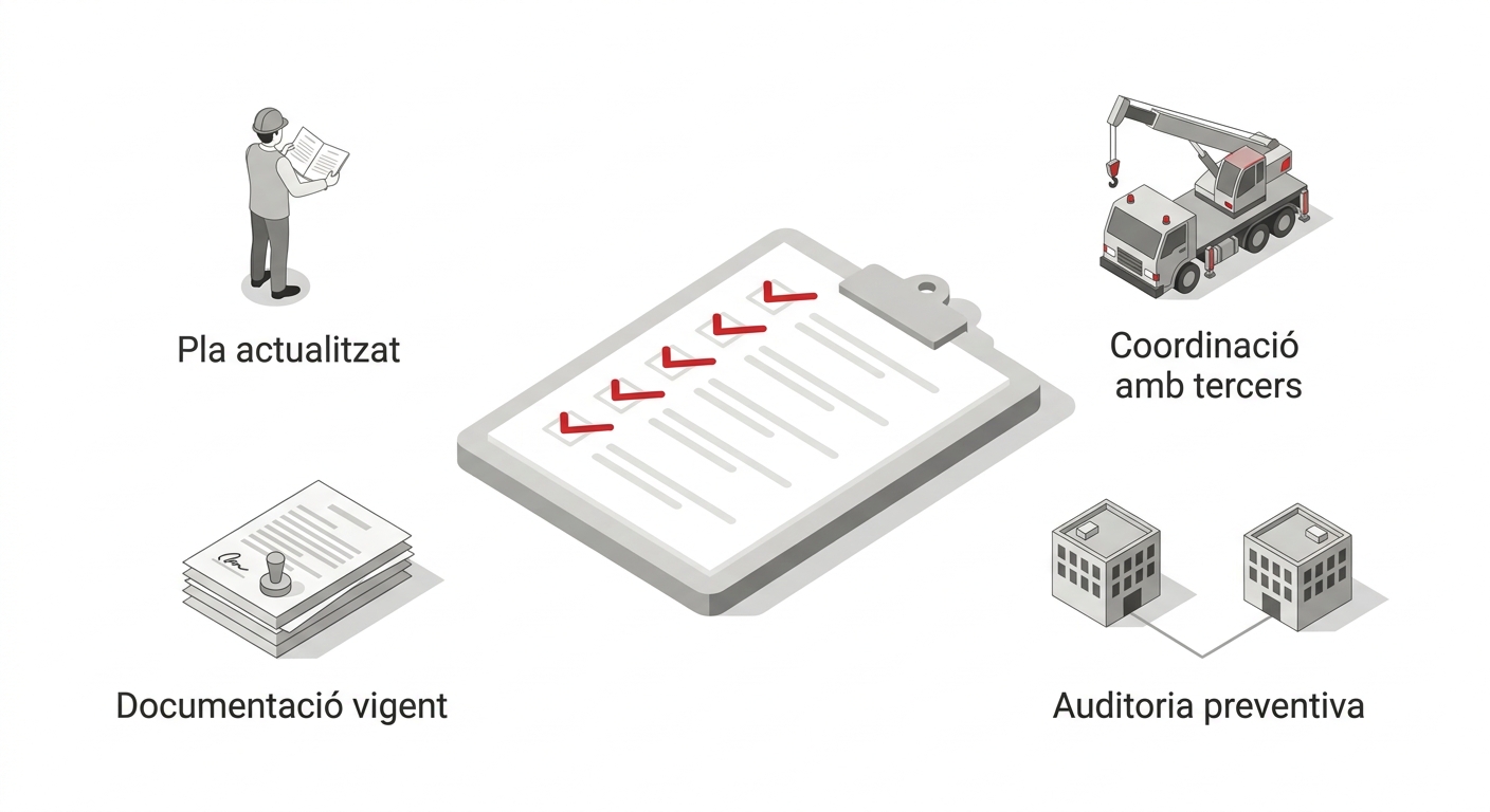 El primer pas és disposar d’un Pla de Prevenció adequat i actualitzat. Aquest document ha de definir la política preventiva, l’organització dels recursos (propis o a través d’un servei de prevenció aliè) i el procediment d’avaluació i seguiment dels riscos. Sense aquesta base, la gestió es fragmenta i augmenta el risc d’incompliments.