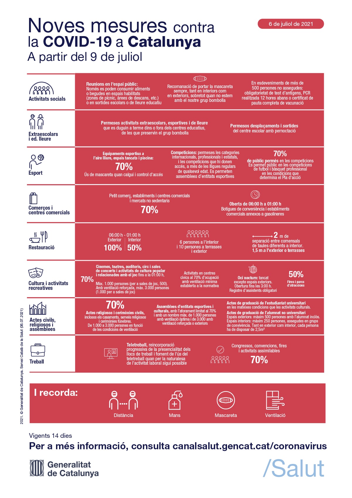 Davant l’increment de positius per la COVID-19, i l’impacte negatiu de la variant delta, a partir del 9 de juliol entren en vigor noves mesures per prevenir els contagis. Els canvis substitueixen la normativa anterior i, en tot cas, seran revisables en funció de la situació epidemiològica, assistencial i de cobertura vacunal de la població.
